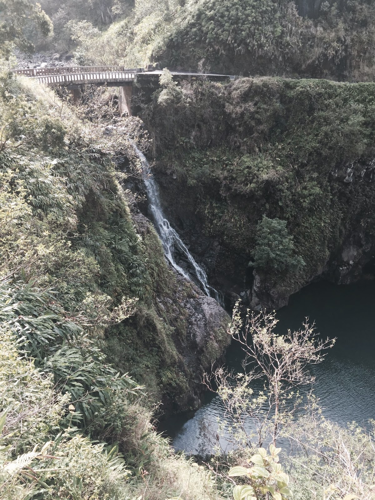 From Pa'ia, we drove until we saw the sign for the twin waterfalls. As you drive the Hana Highway, you will see areas every so often where many cars are parked along the side of the road, and occasionally you'll also see people gawking at something. If you don't know ahead of time that there is some sort of interesting thing to see or do, you may obliviously pass something really interesting. So it's probably a good idea to read up on what you may see. We did not do this! But fortunately our concierge at the hotel told us what to look out for. So we knew that the waterfalls were coming up shortly.